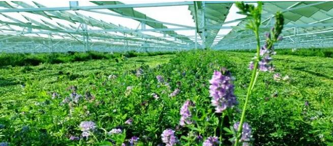 太阳能组件支架阵列采用百叶窗敞开式框架结构设计,利用跟踪支架系统架空2米以上。配重式跟踪支架系统的运用,不需要挖掘和水泥浇筑,不建固定建筑,不破坏耕作层,不改变农用地性质,不影响大型农机作业,提升土地的产出效益,实现“光扶农、光促农、光富农”。
