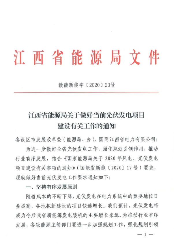 在国家能源局发布2020年,关于光伏行业的管理文件【国发新能能(2020)17号】之后,江西省能源局在近日出台了相应支持光伏行业发展的工作通知,给全国开了个好头,也将带动江西省的光伏行业更好、更快的发展。