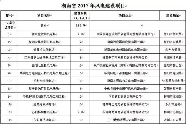 2017年湖南规划:2017年湖南拟开发建设风电项目45个,装机227万千瓦,另有31个、152万千瓦作为备选项目。