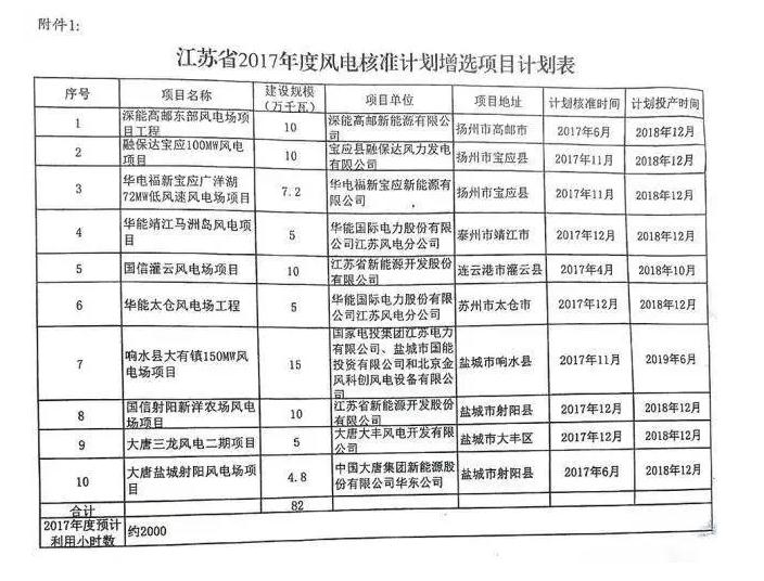 陕西省2017年风电开发建设方案核准计划项目汇总表