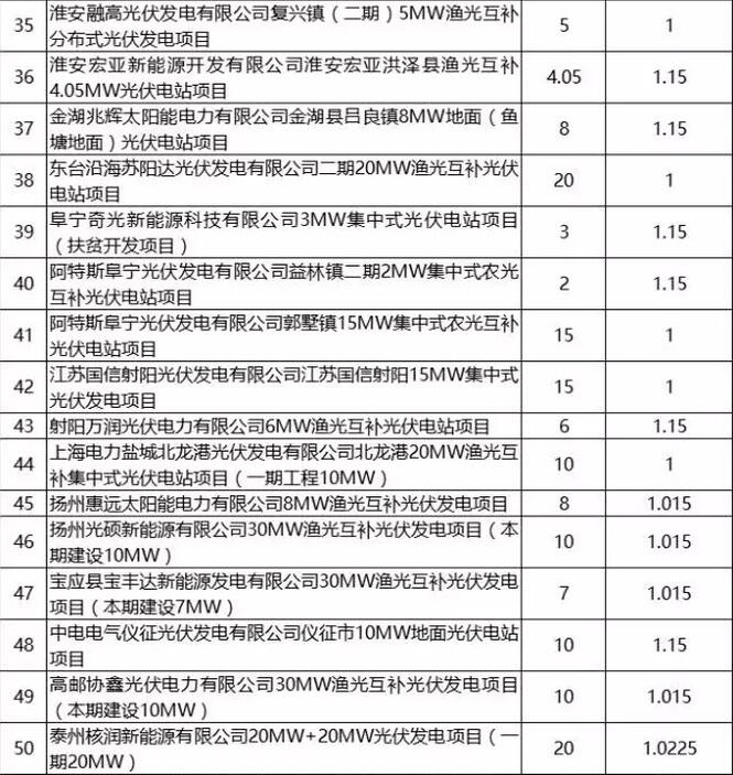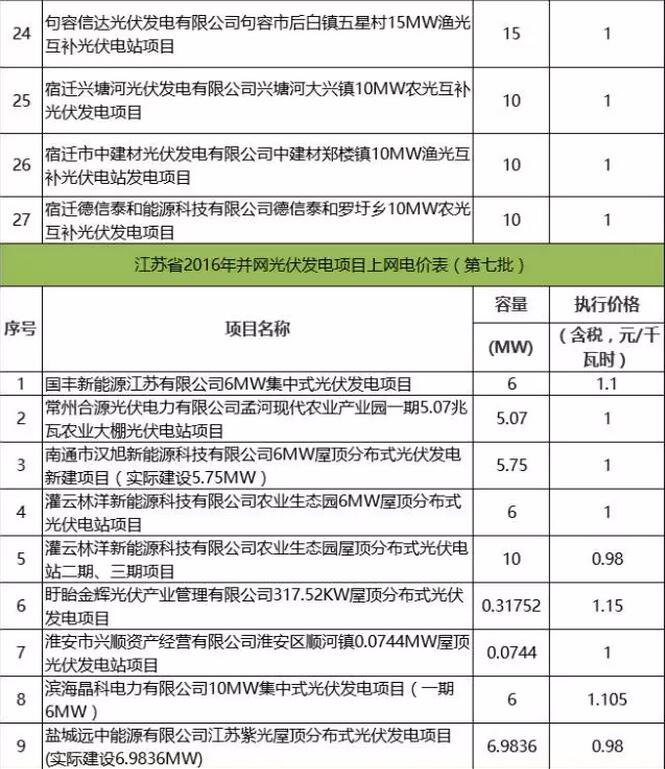 江苏省2016年所有并网光伏发电项目上网电价表。其中光伏发电项目标杆上网电价高于江苏省燃煤机组标杆上网电价的差价部分和接网补贴(每千瓦时0.01元)纳入全国征收的可再生能源电价附加解决,以下上网电价自投入运行之日起执行。