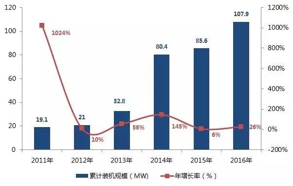 从市场规模看,一方面我国加大力度部署抽水蓄能和熔融盐储热等大规模储能技术,根据国家能源局已公布的数据和CNESA统计,截止2016年底,我国抽水蓄能电站的投运规模超过24GW,占全部储能累计安装量的99%以上,预计到2020年底,抽水蓄能电站装机将达到 40GW。应用于太阳能光热领域的熔融盐储热项目在我国的发展潜力巨大,目前的规划和在建装机超过1.8GW,2016年8月,国内首座塔式10MW熔盐储热项目投运。另一方面,以电化学电池为主的储能技术发展速度较快,据CNESA统计,2000 -2016年(不包含抽水蓄能和储热)的储能累计装机量为189.4MW,年增长率34%。截止2016年底,全球2000年-2016年储能的累计装机(不包含抽水蓄能和储热)为1756.5MW,年增长率为48%,我国在全球占比为11%。