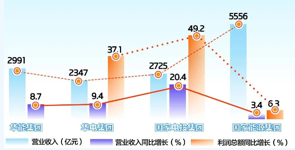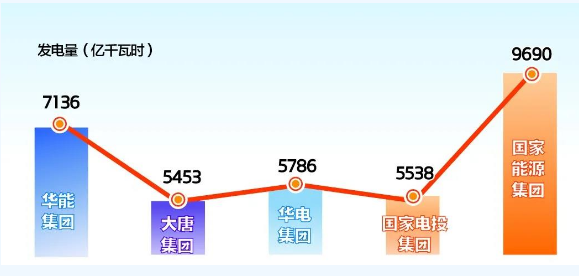 国家能源集团发电量9690亿千瓦时,同比增长1.65%,处在领跑位置。华能集团完成发电量(国内)7136亿千瓦时,同比增长1.56%。华电集团完成实发电量5786亿千瓦时,同比增长4.09%。国家电投集团全力以赴增产增收,全年发电量5538亿千瓦时,同比增长11.2%。大唐集团完成发电量5453亿千瓦时。