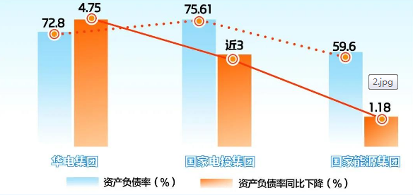 截止到2019年末,国家能源集团资产负债率59.6%,同比降低1.18个百分点,首次低于60%。华电集团资产负债率降至72.8%,同比下降4.75个百分点。国家电投集团资产负债率较年初下降近3个百分点,为75.61%,财务状况持续改善。(华能集团、大唐集团数据略)