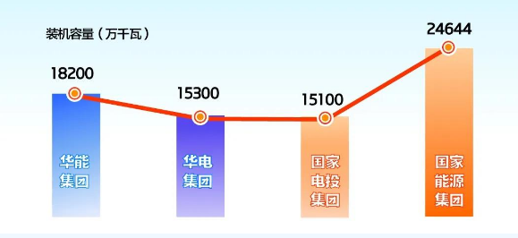 截至2019年底,国家能源集团全年新增电力装机757万千瓦,装机容量达24644万千瓦。华能集团装机总量达到18200万千瓦。华电集团装机容量为15300万千瓦。国家电投集团装机规模达15100万千瓦。(大唐集团数据略)