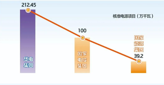 2019年,华能集团新能源发展创历史最好水平,全年新增502万千瓦,是上年的4倍,项目核准(备案)、开工、投产均创历史新高。华电集团全年核准电源项目212.45万千瓦。国家电投集团取得鲁固直流通辽基地100万千瓦风电项目核准。国家能源集团完成四川绰斯甲电站(39.2万千瓦)核准。(华能集团、大唐集团数据略)