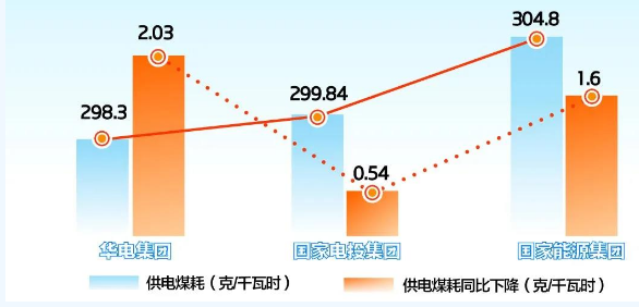 2019年,华电集团供电煤耗完成298.3克/千瓦时,同比下降2.03克/千瓦时,实现了300克/千瓦时以下的历史性突破。国家电投集团供电煤耗同比降0.54克/千瓦时,为299.84克/千瓦时。国家能源集团供电煤耗完成304.8克/千瓦时,同比下降1.6克/千瓦时。(华能集团、大唐集团数据略)