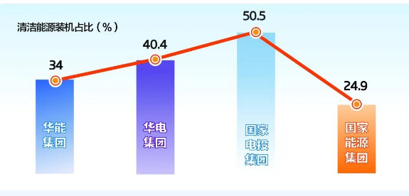 从清洁能源装机占比来看,2019年,国家电投集团清洁能源装机占比50.5%;光伏发电装机1929万千瓦,继续保持世界第一。华电集团清洁能源装机占比达到40.4%,同比提高0.71个百分点。华能集团结构调整取得新突破,低碳清洁能源装机超过6100万千瓦,装机比重超过34%。国家能源集团非化石能源装机占比为24.9%,同比提高0.5个百分点。(大唐集团数据略)