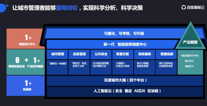 这套架构方案分为三部分:底层是智慧城市新基建,包含人工智能云和百度城市大脑,其中人工智能云具备安全、稳定、自主可控的优势,基础云还通过百度的昆仑AI芯片提供人工智能算法需要的算力,以及百度超级链提供区块链底层能力。百度城市大脑包括城市感知中台、知识和数据中台、AI中台和智能交互中台;中间应用层则是基于城市大脑,对城市管理、应急管理、公共安全、智慧交管、政务服务、智慧旅游等6大场景持续赋能。同时通过飞桨、昆仑AI芯片、鸿鹄语音交互芯片等为企业提供AI应用的基础技术支撑和AI人才培养等服务;让企业开发者可以快速获得业内效果最好、研发成本最低、技术最先进、且全面自主可控的AI创新工具与服务,协助各地实现产业经济发展新动能。