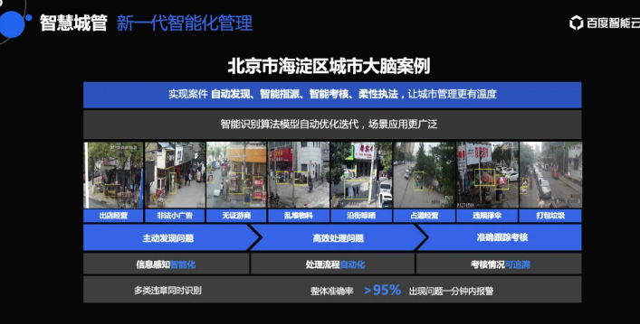 在城市管理方面,百度智慧城市通过一网通管、案件智能处理等服务,优化案件的发现、审核、立案、处置、结案等环节,改善传统网格化管理的流程长、耗费人力等问题。比如百度参与建设的北京海淀区城市大脑,能够智能识别出店经营、非法广告、无证游商、乱堆物料、沿街晾晒等十几种城市管理违规事件,且识别准确率超过 85%,误报率低于 15%。通过自动发现、智能指派、智能考核以及柔性执法,使城管案件处置效率和市民满意度均得到提升。