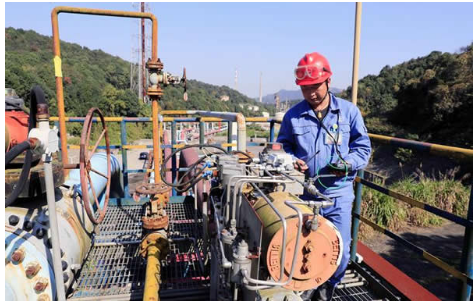 11月4日,巴陵石化炼油部环己酮装置(车间)氢气分输站,当班员工对运行中的国内最长氢气输送管线进行巡检。