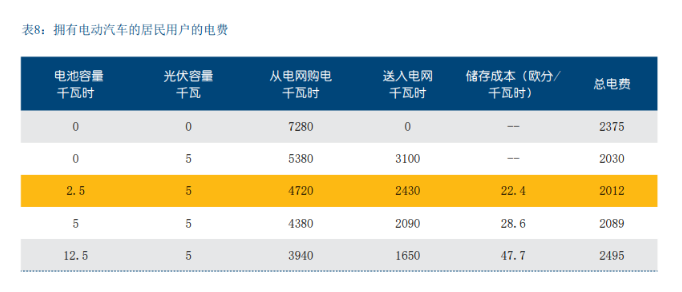 在电池系统成本大幅下降至不到700欧元/千瓦时的背景 下,到2021年,与未部署电池的系统相比,部署电池系 统的总用电成本较低。一个电力需求4000千瓦时的普通 家庭,加上一辆电动汽车3280千瓦时的额外用电需求, 每年需要支付2375欧元的电费(见表8)。对于这样的 家庭来说,安装5千瓦的光伏系统是有利可图的,因为与从电网购电相比,自发自用的用电成本更低,每年的 电费将减少到2030欧元。自用剩余的3100千瓦时的电力 以3美分/千瓦时的低价送入电网。使用电池储能增加自 发自用的比例,每年可将居民家庭电费减少到2012欧 元。
