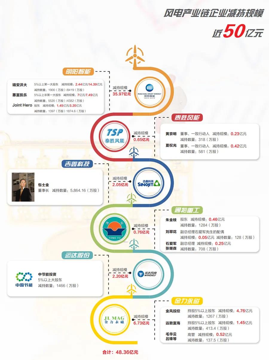 相比之下,风电板块减持规模相对较小。包括明阳智能、运达股份、泰胜风能、吉鑫科技、通裕重工、金力永磁在内,风电上市公司大股东、高管减持规模在50亿元左右。