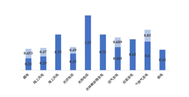 2020年,各种类型发电项目的电价如下图所示。