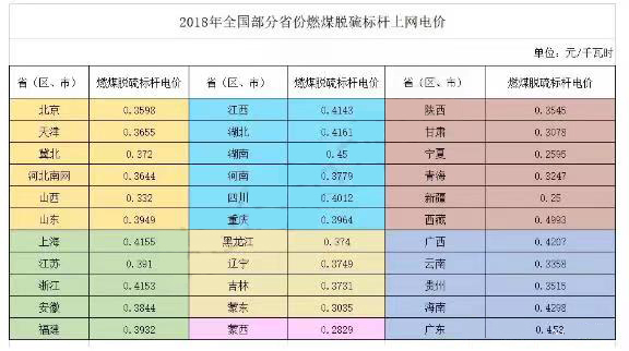 2019年9月26日,国务院常务会议决定完善燃煤发电上网电价形成机制,从明年1月1日1日起,取消煤电联动机制,将现行标杆上网电价机制,改为“基准价+上下浮动”的市场化机制。基准价按各地现行燃煤发电标杆上网电价确定,浮动范围为上浮不超过10%、下浮原则上不超过15%,具体发电企业、售电公司、电力用户等通过协商或竞价确定,但明年暂不上浮,特别要确保一般工商业平均电价只降不升。2018年燃煤火电机组分省脱硫标杆上网电价如图。