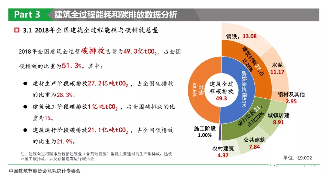根据中国建筑节能协会能耗专委会最新发布的《中国建筑能耗研究报告(2020)》,2018年全国建筑全过程能耗总量为21.47亿tce,占全国能源消费总量比重为46.5%。2018年全国建筑全过程碳排放总量为49.3亿tCO2,占全国碳排放的比重为51.3%。