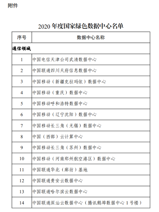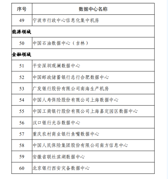 中华人民共和国工业和信息化部 中华人民共和国国家发展和改革委员会 中华人民共和国商务部 国家机关事务管理局 中国银行保险监督管理委员会 国家能源局等六部委联合发布,确定了60家2020年度国家绿色数据中心名单如下: