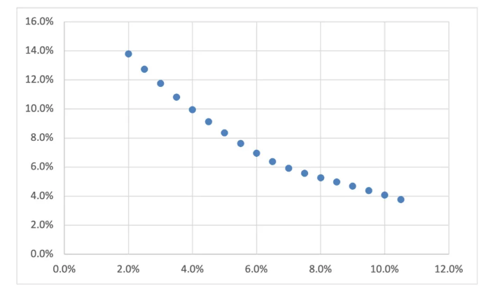 图2 股权IRR8%的情况下不同长期贷款利率(横轴)下项目IRR要求(纵轴)(假设同图1)