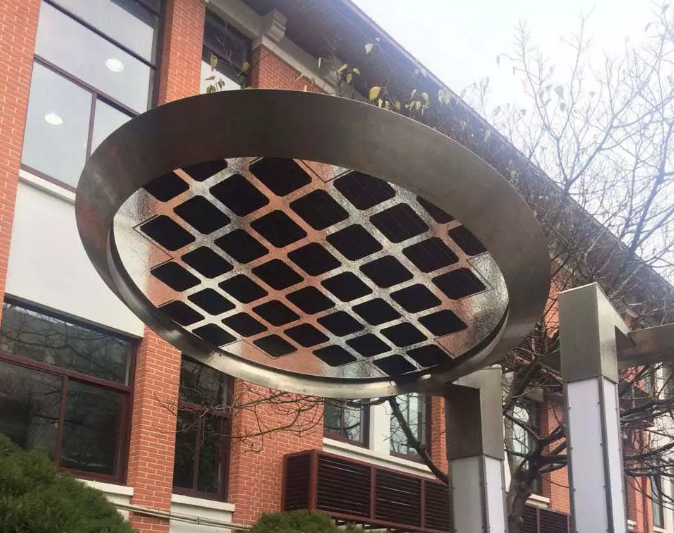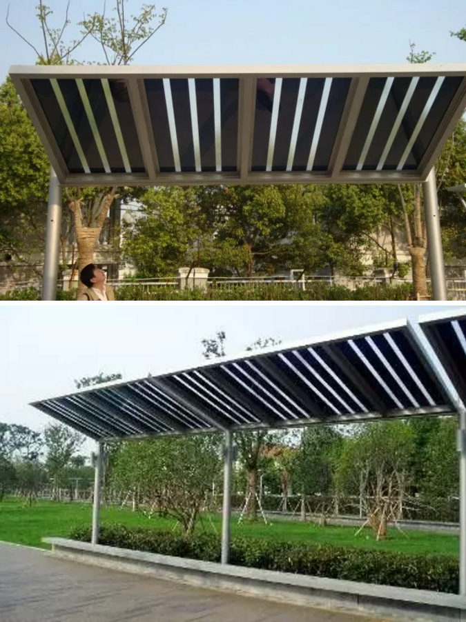 电梯间上方是由太阳能玻璃幕墙构建成的一个集遮荫、排风和太阳能发电等等多功能为一体的光伏建筑一体化应用形式。