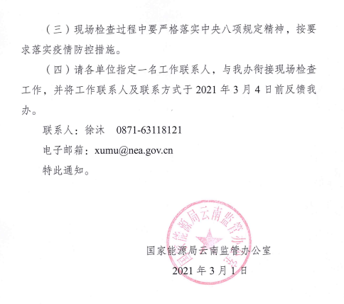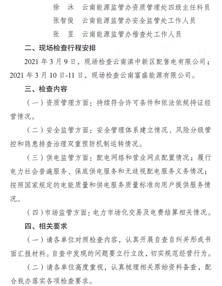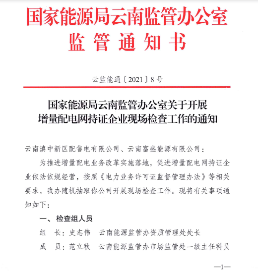 北极星售电网获悉,日前云南能监办发布《关于开展增量配电网持证企业现场检查工作的通知》,称3月9日,现场检查云南滇中新区配售电有限公司,3月10-11日,现场检查云南富盛能源有限公司。详情如下: