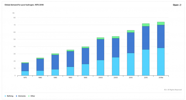 国际能源署(IEA)成立于1974年,目的是确保石油供应安全。该机构对能源转型的预测记录不佳,但从历史统计数据来看,它非常可靠。在2019年的《未来的氢》报告中,国际能源署透露了清洁、绿色氢的一个小秘密:目前大部分氢用于石油工业的炼油厂,这是过去30年市场增长的主要来源。
