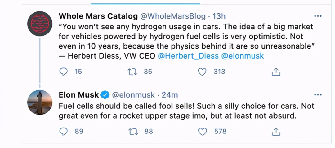 氢云链了解到,这并非马斯克第一次唱衰燃料电池在汽车上的应用前景。早在2013年,他就在活动中宣称,燃料电池作为车用动力源简直太过离谱,氢气更适合用来做火箭燃料而不是车用动力。此后2017年4月,马斯克更是创造了金句“Fuel Cells=Fool cells”;随后他也一再表示,燃料电池技术根本就是在胡扯、燃料电池是“笑料电池”。