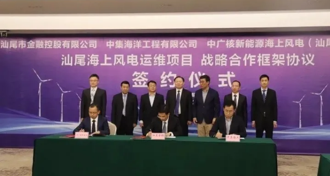 3月26日,汕尾海上风电运维项目战略合作框架协议签约仪式在汕尾市友谊宾馆举行。仪式上,汕尾市金融控股有限公司、中集海洋工程有限公司和中国广核新能源海上风电(汕尾)有限公司三方共同签订汕尾海上风电运维项目战略合作框架协议。