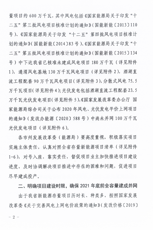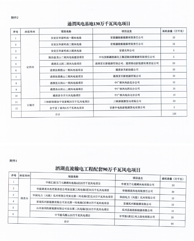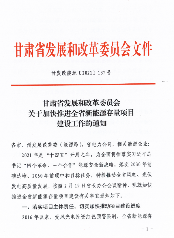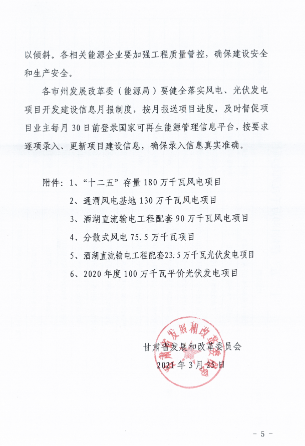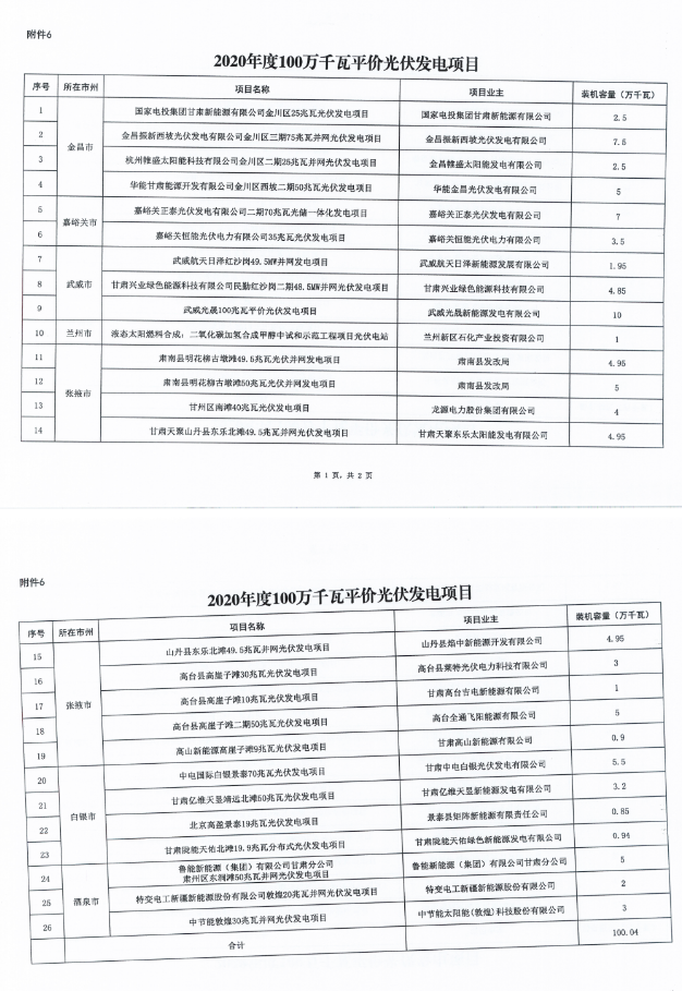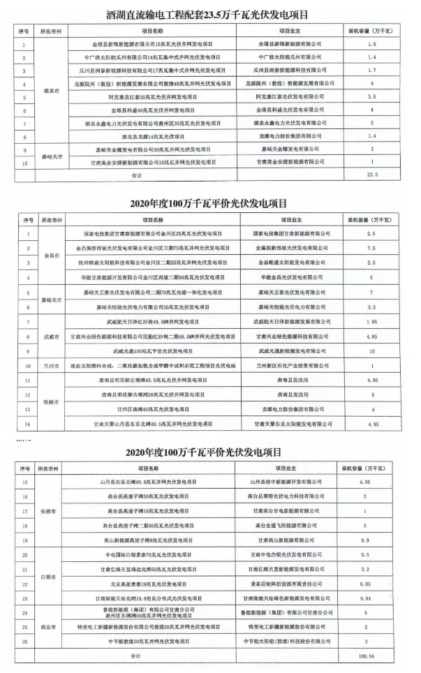 3月25日,甘肃省发改委发布《关于加快推进全省新能源存量项目建设工作》的通知。文件明确,甘肃省目前新能源存量项目约600万千瓦。其中,光伏发电项目1.23GW包括:酒湖直流工程配套23.5万千瓦光伏发电项目以及《国家发展改革委办公厅国家能源局综合司关于公布2020年风电、光伏发电平价上网项目的通知》(发改办能源〔2020〕588号)中尚未并网100万千瓦光伏发电项目。
