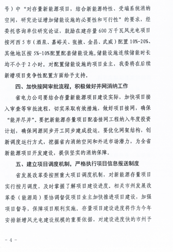 此外,文件还明确鼓励配置储能设施,鼓励全省在建存量600万千瓦风光电项目按河西5市(酒泉、嘉峪关、张掖、金昌、武威)配置10%-20%、其他地区按5%-10%配置配套储能设施,储能设施连续储能时长均不小于2小时。对配置储能设施的项目业主,甘肃省发改委将在后续新增项目竞争性配置方面给予支持。