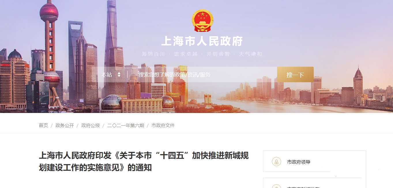 近日,上海市人民政府印发《关于本市“十四五”加快推进新城规划建设工作的实施意见》的通知。