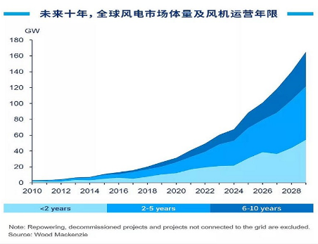 全球海上风电运维市场仍未成熟,在面临长期运维问题与机组故障时缺乏经验。目前,全球仅1.8GW的海上风电项目运营时长超过10年。预计至2029年,该容量将增至约20GW。然而,届时近90%的在运行机组(即165GW容量)运行时长仍将不足10年。