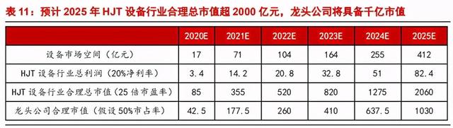 2)预计2025年HJT设备市场空间有望超400亿元,5年CAGR为80%。在净利率20%的盈利假定下,25倍PE假定下,HJT设备行业市值2000亿元。预计行业龙头市占率有望超过50%,未来有望达千亿级市值。