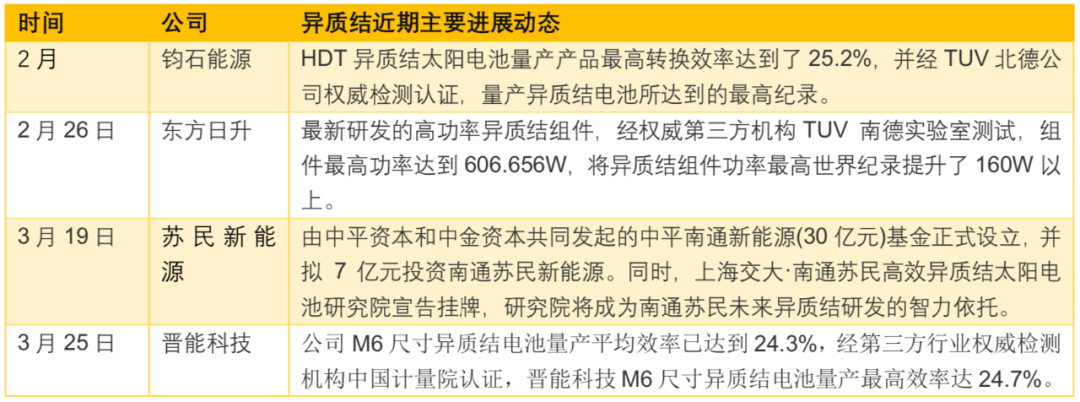 除了安徽华晟,2020年下半年通威金堂、阿特斯、爱康科技等公司多个异质结项目完成了设备招标,国内异质结建设加速,几大龙头电池厂也绝大多数已有相关异质结技术布局。