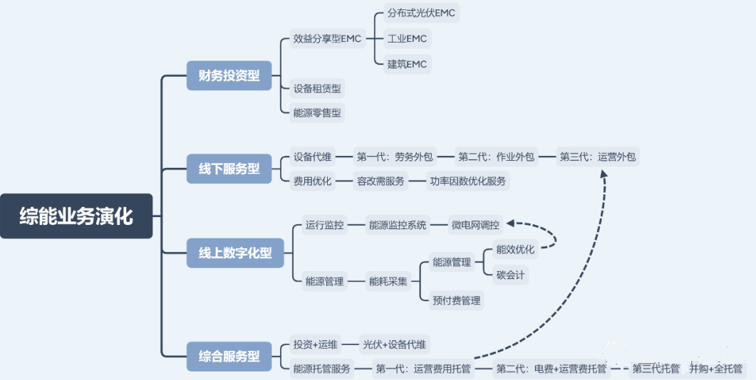 总体上,我们认为目前的综合能源主要是四大类商业模式,每类商业模式又有其自身的流变过程。