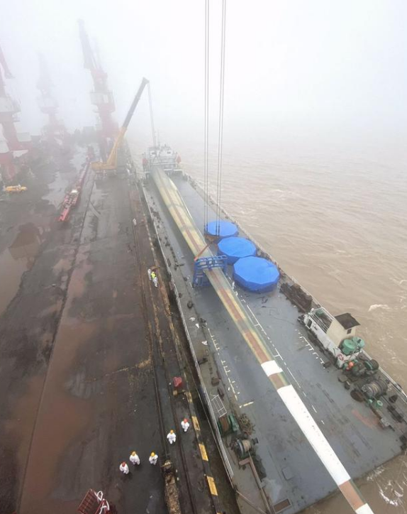 此前大丰港区吊装的最长风电叶片为90米。为确保此次叶片成功出运,码头吊装团队经过多次推演和模拟练习,最终采用“门机+汽吊”协同抬吊的方式。
