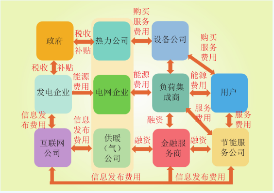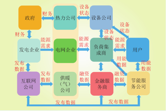 在园区综合能源服务中,存在政府(园区管委会)、电网企业、发电企业(分布式发电)、供暖(气)公司、热力公司、用户、售电公司(负荷集成商)、设备公司、节能服务公司、互联网企业和金融服务商等相关利益方。