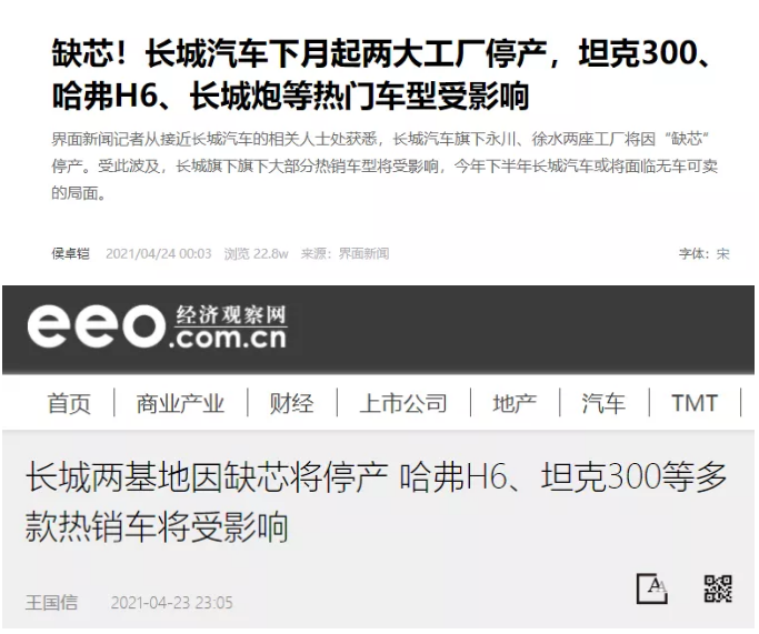近日,据多家媒体综合报道,遭遇“芯片荒”长城汽车,永川、徐水两大生产基地或将面临停产。两个工厂停产后,长城汽车目前正在热销的多个爆款车型都将受到影响。包括人气非常火爆的坦克300、长城炮、哈弗部分车型等,都将同步停产。如果该消息属实,那么长城汽车将成为继蔚来之后,自主品牌中第二家因芯片问题而出现多个生产线停产的车企。