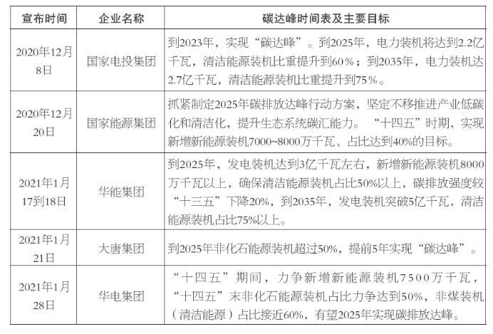 表1 五大发电企业碳达峰时间表及主要目标图片