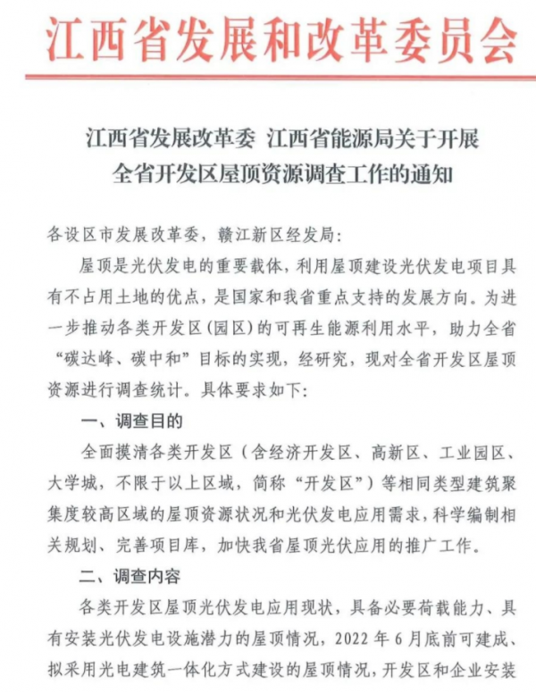 通知强调,屋顶是光伏发电的重要载体,利用屋顶建设光伏发电项目有不占用土地的优点,是国家和江西省重点的发展方向。各地要高度重视,迅速开展调查摸底工作。