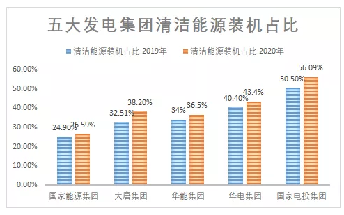 截至2020年底,国家电投集团、华电集团、大唐集团、华能集团、国家能源集团清洁能源装机占比分别为56.09%、43.4%、38.20%、36.5%、26.59%,幅度分别提升5.59、3、5.69、2.5、1.69个百分点。其中国家电投清洁能源装机占比遥遥领先,大唐集团去年速度提升最大。