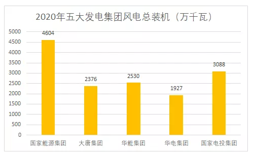 截至2020年底,国家能源集团、国家电投集团、华能集团、大唐集团、华电集团风电总装机分别为4604万千瓦、3088万千瓦、2530万千瓦、2376万千瓦、1927万千瓦,其中国家能源集团遥遥领先。
