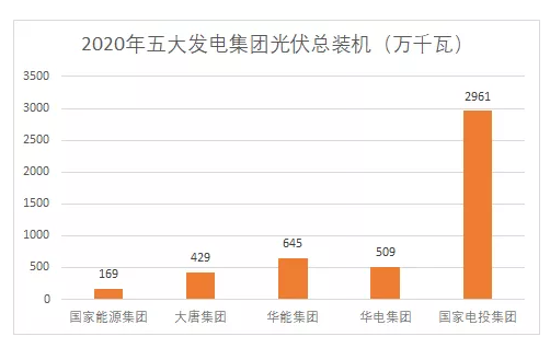 截至2020年底,国家电投集团、华能集团、华电集团、大唐集团、国家能源集团光伏总装机分别为2961万千瓦、645万千瓦、509万千瓦、429万千瓦、169万千瓦,其中国家电投遥遥领先。