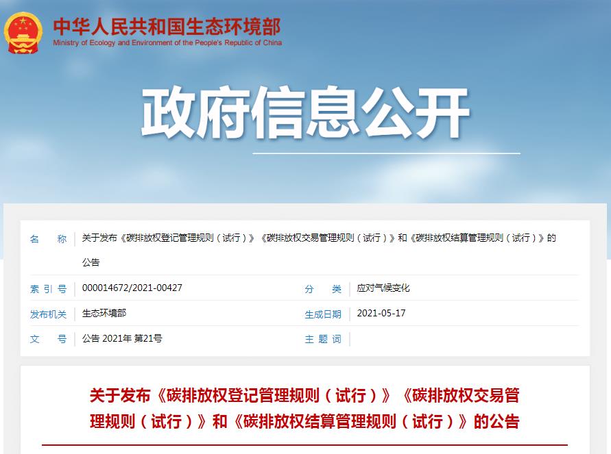 关于发布《碳排放权登记管理规则(试行)》《碳排放权交易管理规则(试行)》和《碳排放权结算管理规则(试行)》的公告