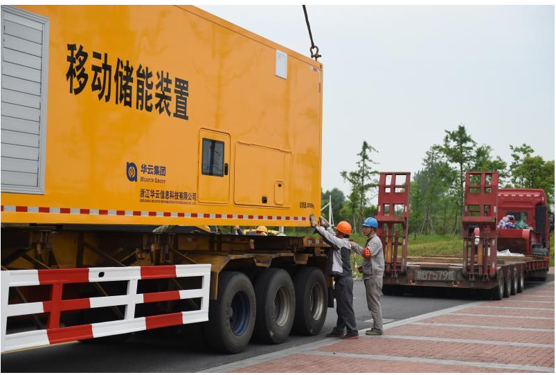 5月31日,一辆装载着集装箱的大卡车缓缓驶入了海宁市尖山新区体育馆。车一停下,几名来自海宁市金能电力实业有限公司的施工人员就在卡车边上布置安全围栏,随后打开集装箱,对里面的设备进行调试。集装箱上,"移动储能车"几个大字十分醒目。