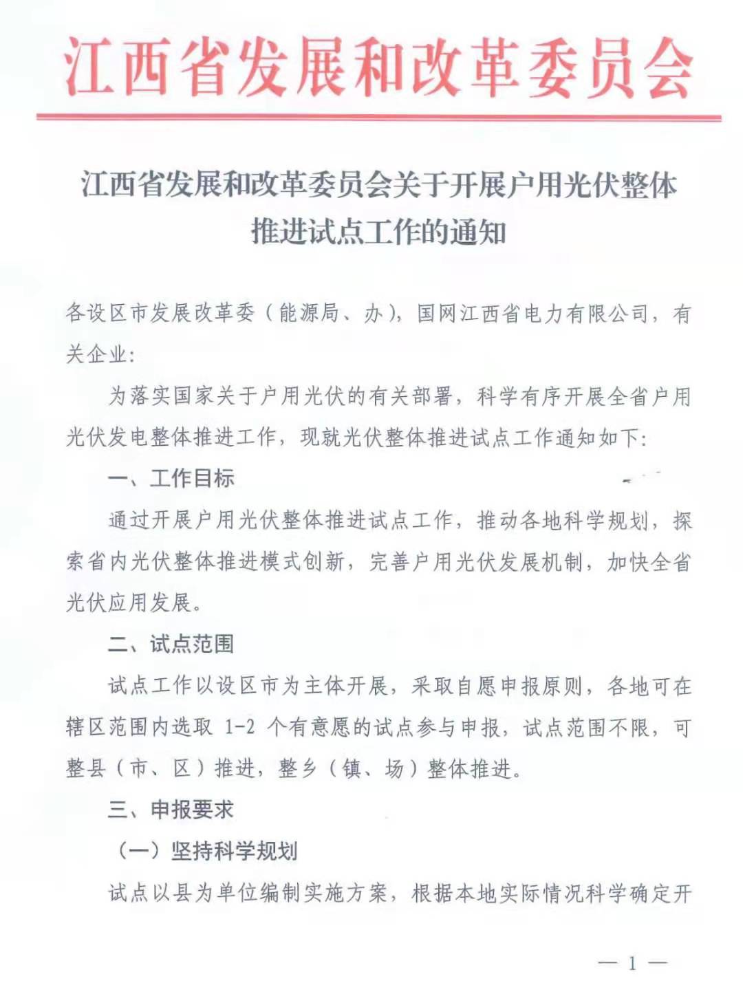 继山东、陕西、福建、广东4省陆续发文开展户用/分布式光伏整县推进试点工作后,6月11日,江西省发改委下发《关于开展户用光伏整体推进试点工作的通知》,提出:鼓励县企合作,按照自愿的原则,开展户用光伏整县、整镇推进的工作。通知指出,为加快推进分布式光伏发电发展,将组织开展整县(市),整乡(镇、场)推进户用光伏开发试点工作。请具备较大规模开发利用屋顶资源、且电网接入和消纳条件良好的地市,积极组织申报试点方案。具体原文如下: