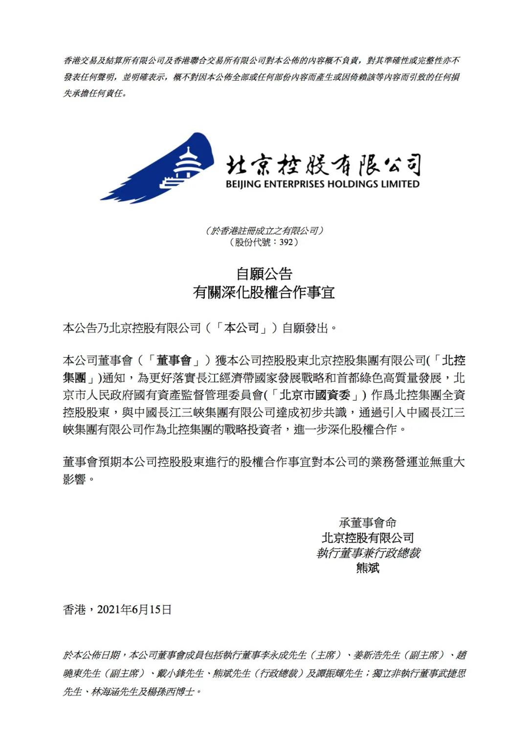 6月15日晚间,北京控股发布公告,董事会获公司控股股东北京控股集团有限公司通知,为更好落实长江经济带国家发展战略和首都绿色高质量发展,北京市国资委作为北控集团全资控股股东,与中国长江三峡集团有限公司达成初步共识,通过引入中国长江三峡集团有限公司作为北控集团的战略投资者,进一步深化股权合作。