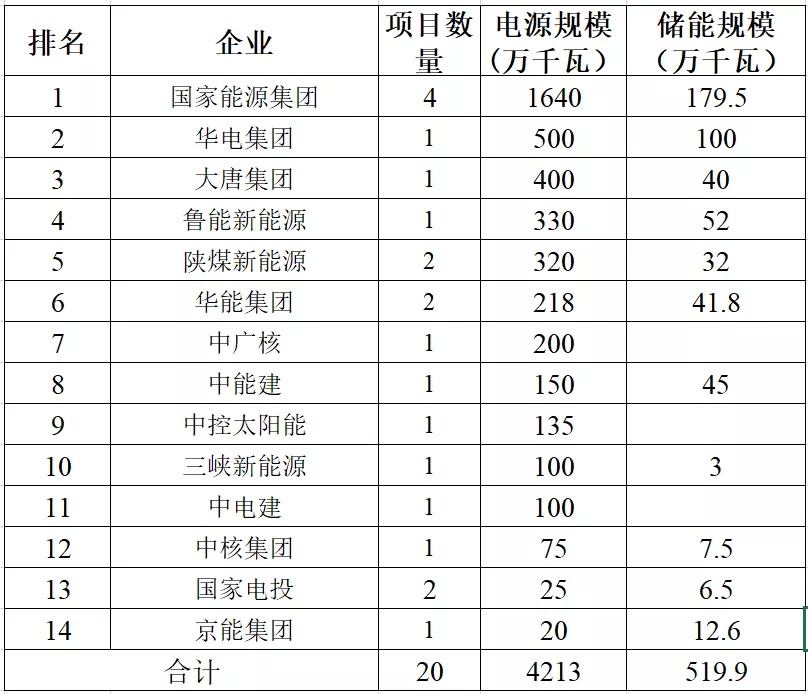42.13GW项目一共有14家企业参与,国家能源集团、华电、大唐的规模最大,每家企业的具体规模如下。