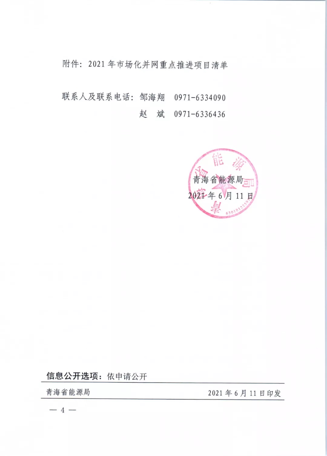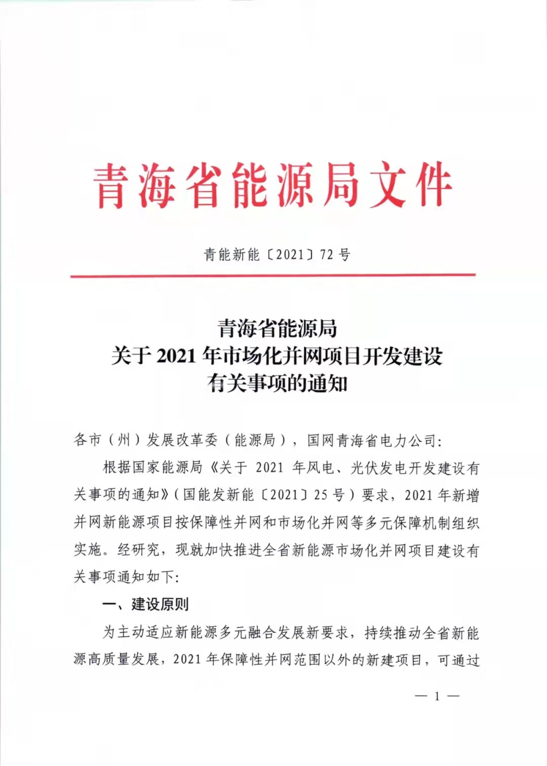 6月11日,青海省能源局下发《关于2021年市场化并网项目开发建设有关事项的通知》(青能新能〔 2021〕72号)提出: