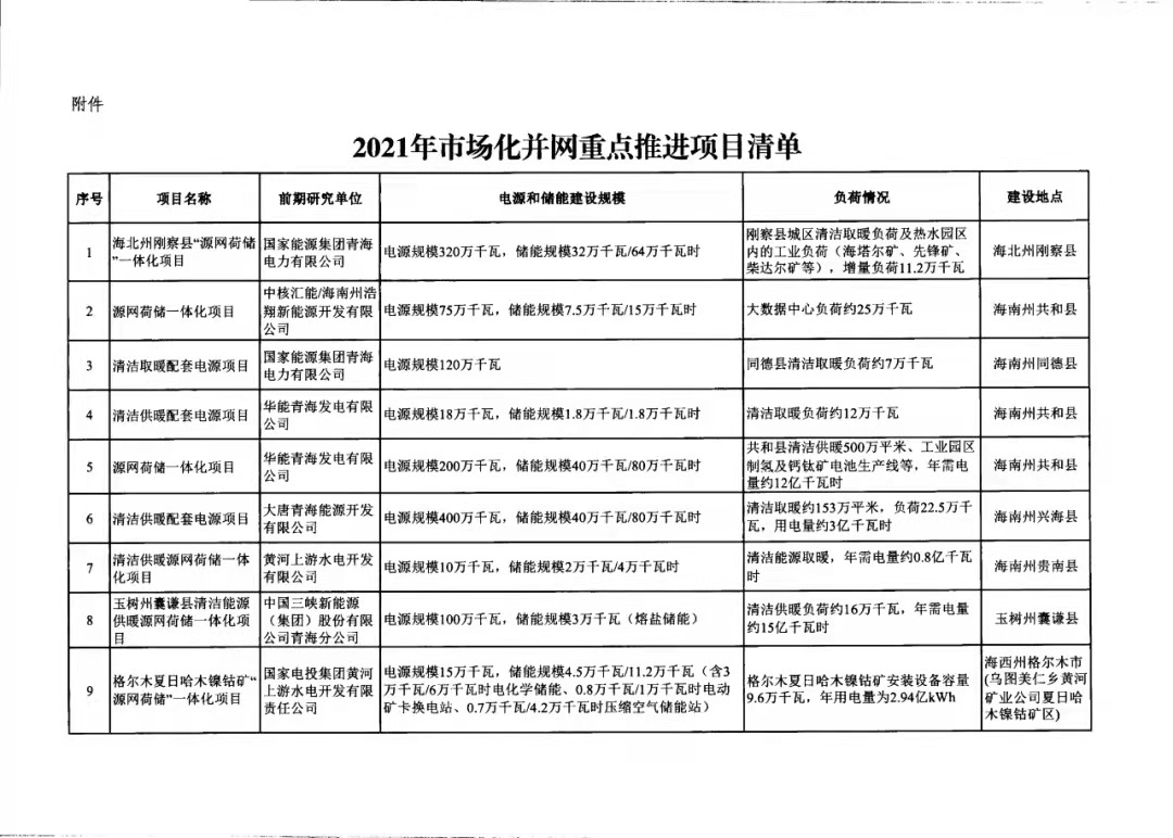 在综合考虑建设条 件成熟度、负荷落地可能性、储能配置比例及企业综合能力等因素后,先行筛选确定2021年市场化并网重点推进项目20个,总规模为4213万kW,并配置520万kW的储能规模。