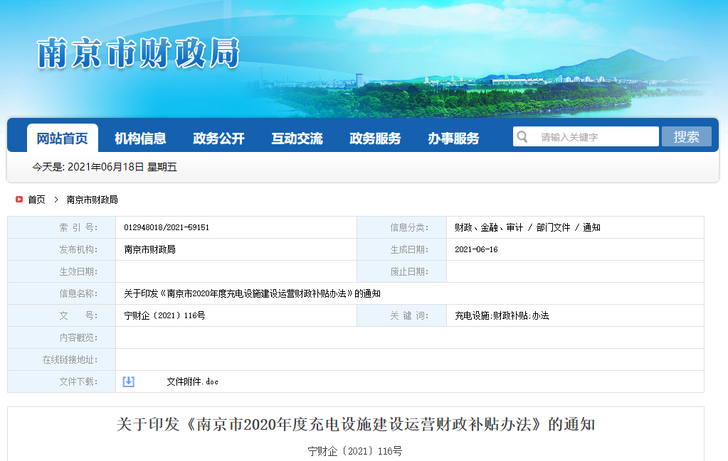 关于印发《南京市2020年度充电设施建设运营财政补贴办法》的通知